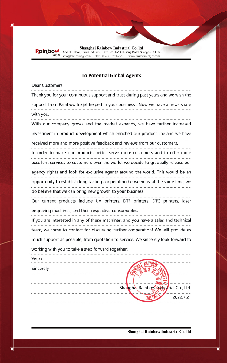 Si Rainbow Inkjet kanunay nga nagtrabaho kauban ang bug-os nga paningkamot aron matabangan ang mga kliyente sa tibuuk kalibutan nga nagtukod sa ilang kaugalingon nga negosyo sa pag-imprinta ug kanunay kami nangita alang sa mga ahente sa daghang mga nasud.